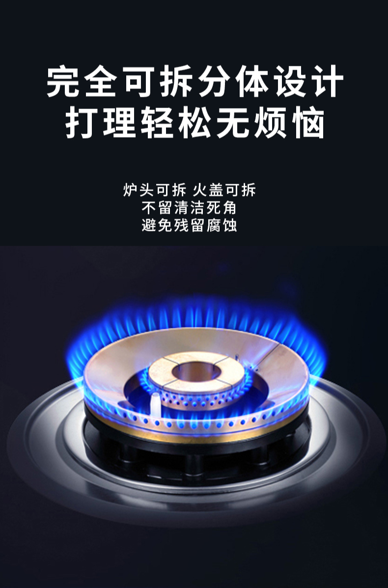 大火力,70%熱效率;智能煙灶聯(lián)動(dòng);全銅燃燒器;完全可拆分設(shè)計(jì);主動(dòng)熄火保護(hù);