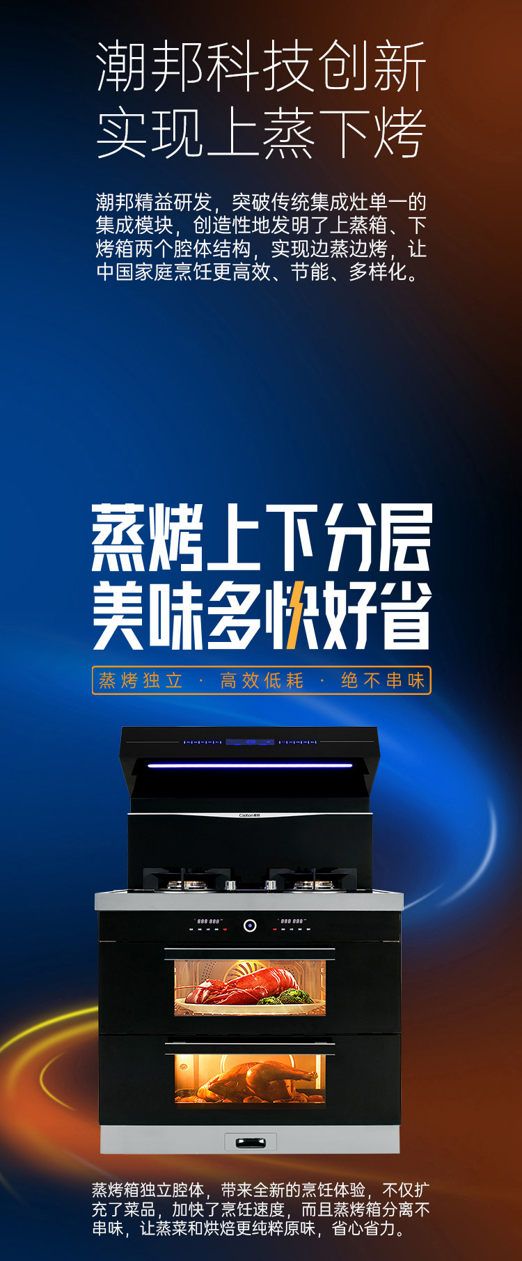 上蒸箱、下烤箱,實(shí)現(xiàn)邊蒸邊烤。更高效,更節(jié)能。
